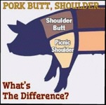 This one is important, not only because the name is confusing, but because of the popularity of the cut. Along with pork ribs, this is one of the most used cuts of pork. Despite the name "butt", it has nothing to do with the tooter (ass) end of the hog. Instead, the cut comes from the front shoulder of the pig. So why "butt"? During colonial days New England butchers tended to take less prized cuts of pork like these and pack them into barrels for storage and transport. The barrels the pork went into were called butts.