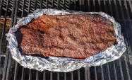 This is a technique similar to braising except the meat is not completely covered but rather the foil is left open on top creating the shape of a boat, hence the term "Boating". After smoking for the desired length of time, the meat is placed in a boat shaped piece of foil. Liquid is then poured in the pan to about 1/2 way up the meat. The foil boat is then returned to the smoker to allow the meat to reach it's desired internal temperature and tenderness. The top 1/2 of the meat is left above the liquid so the bark remains intact but the lower area of the meat is tenderized by the liquid the same as in braising. Any liquid of your choice can be used. Some popular ones are broth, beer, wine, fruit juices or even plain water. This method is generally used with tougher cuts of meat such as brisket or beef cheek.